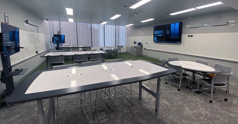 A view of a Monash University classroom showing three tables, two displays and a Nureva audio system