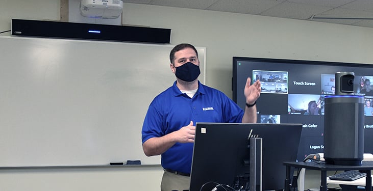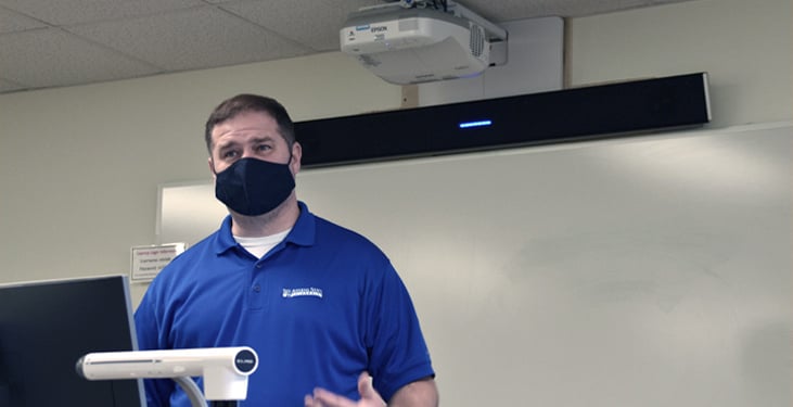 Instructor teaching in a hybrid classroom at Athens State University with a Nureva HDL300 audio system