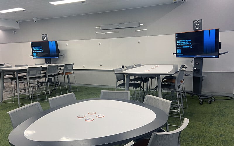 A view of a Monash University classroom showing three tables, two displays and a Nureva audio system