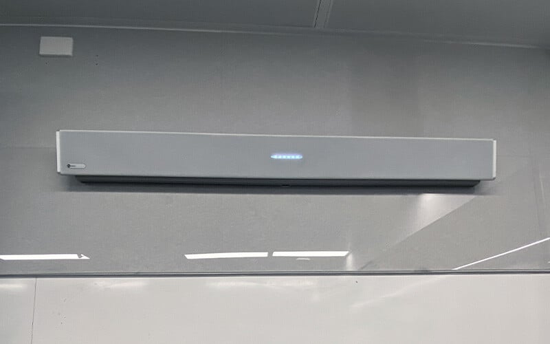 A Nureva microphone and speaker bar on a classroom wall