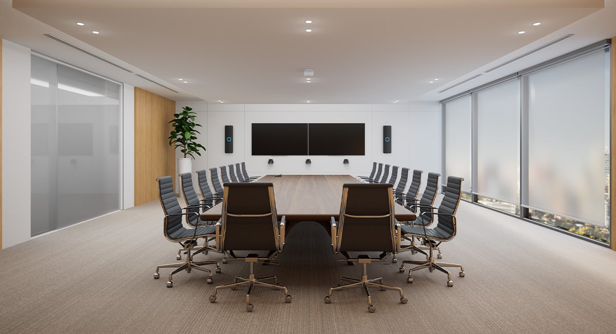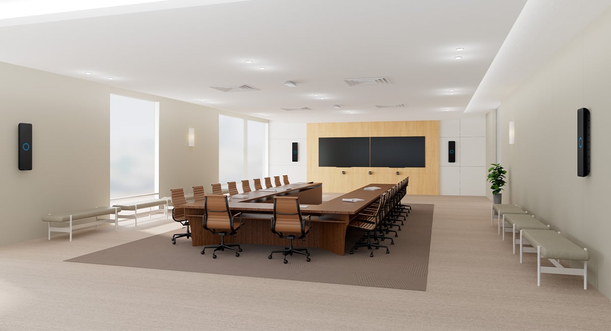 Our wall-mounted audio bars come in pairs for spatial audio functionality and better sounding music playback. They combine speakers and microphones for room-filling sound and exceptional pickup.